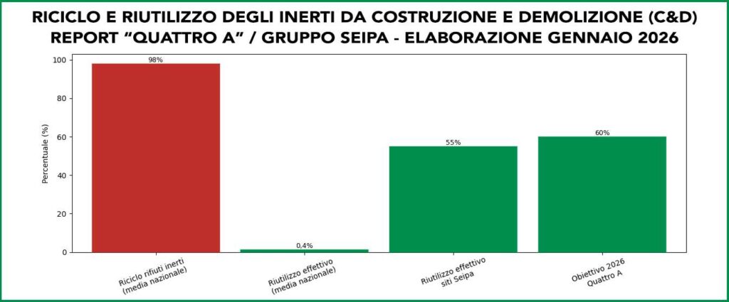 Accanto al dato medio nazionale, Quattro A richiama le best practice di filiera: nei siti del Gruppo Seipa di cui l’azienda fa parte, il tasso di sostituzione degli aggregati arriva a superare il 50% (con valori riportati fino al 55%), dimostrando che la chiusura del ciclo è realizzabile su scala industriale.